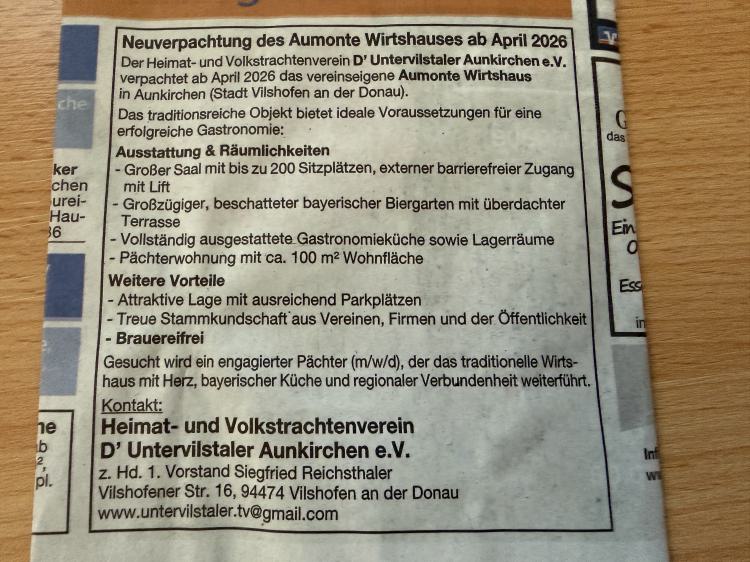 Wir suchen ab April 2026 neue Pächter/in für unser Vereinsheim "Aumonte-Wirtshaus" in Aunkirchen!